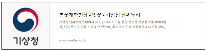 기상청 날씨누리에서는 계절을 관측하여 봄꽃개화 현황-벚꽃을 실시간으로 안내 해주고 있습니다.