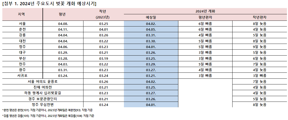 2024년 3월 24일에 제주도 서귀포에서의 시작을 기점으로 남부 지방은 3월 22일~ 31일, 중부지방은 3월 30일 ~4월 7일, 경기 북부와 강원 북부 및 산간 지방은 4월 7일 이후에 개화할 것으로 예상 되며 절정 만개는 일주일정도 소요된다고 합니다.
